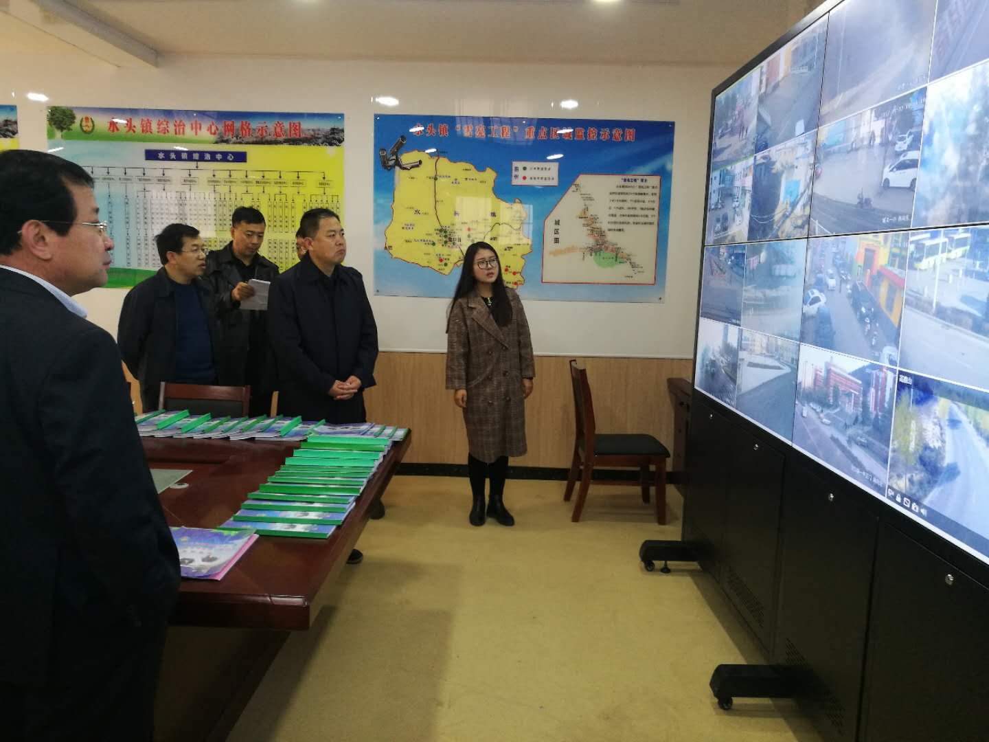 交口县县长乔劲松,县委常委、政法委书记刘青平在水头镇综治中心视频监控指挥中心调研